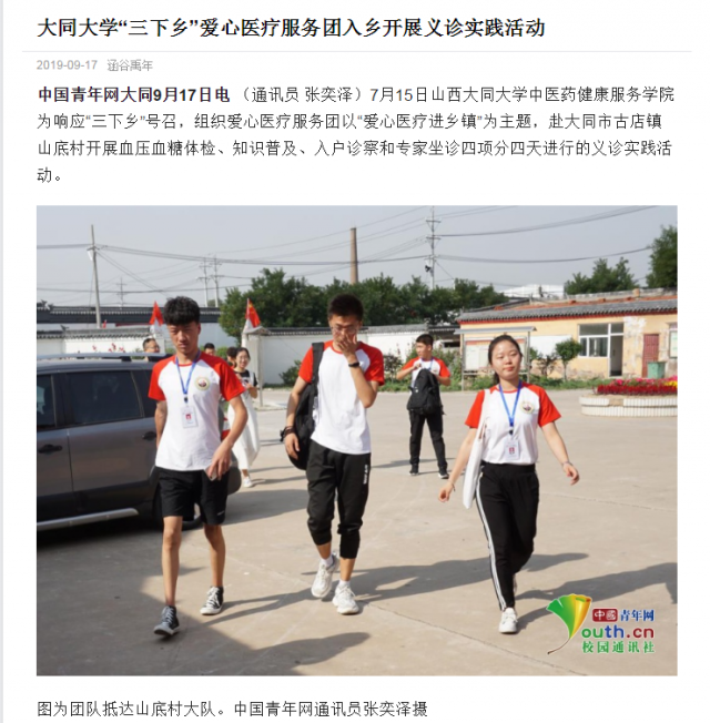 中国青年网大同9月17日电(通讯员张奕泽)7月15日山西大同大学中医药健康服务学院为响应“三下乡”号召,组织爱心医疗服务团以“爱心医疗进乡镇”为主题,赴大同市古店镇山底村开展血压血糖体检、知识普及、入户诊察和专家坐诊四项分四天进行的义诊实践活动。