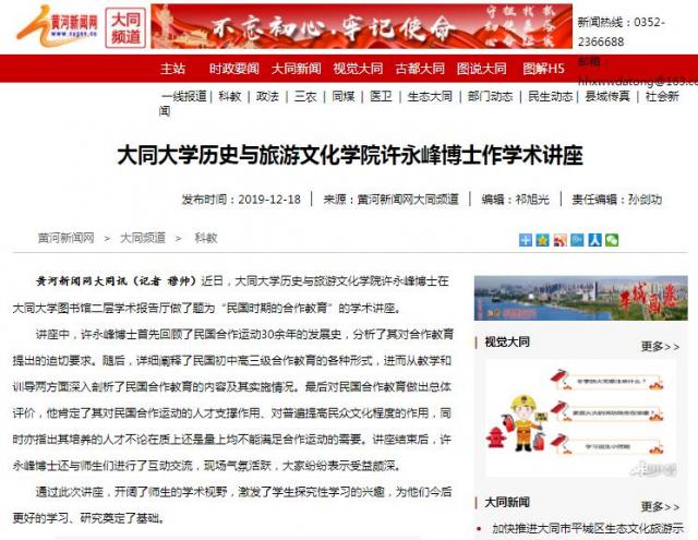 黄河新闻网大同讯(记者穆帅)近日,大同大学历史与旅游文化学院许永峰博士在大同大学图书馆二层学术报告厅做了题为“民国时期的合作教育”的学术讲座。
