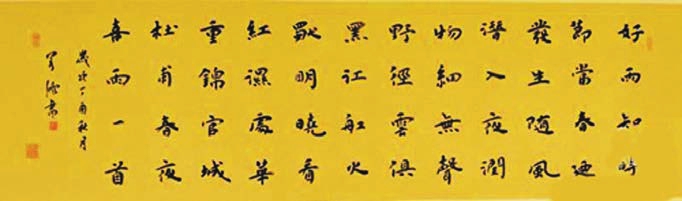近年来,雁鸿又旁及行草,苦苦临习历代名帖。其楷书取法魏晋,在细微处见端妙;其行草取法二王,用笔理解独到。尤为难能可贵的是,他将古篆的结构与笔法融合在一起,并将融合后的风格表现在其行书作品中,使行书作品别具一格。近一时期,又苦抚摩崖石刻,全身心投入到中国字由石质平面向纸质平面转换的揣摩体会。