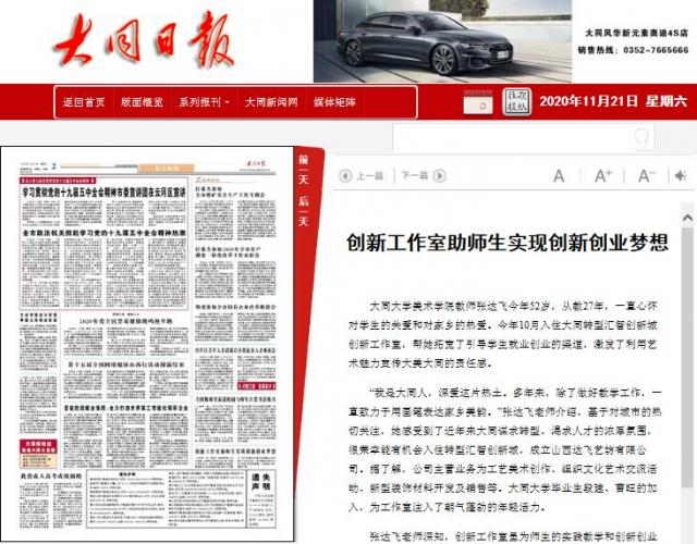 身为优瑞卡环球艺术集团策展人之一,张达飞老师正努力凭借自己的专业优势和人脉关系,(下转第二版) (上接第一版)策划一场国际线上艺术展览,以期吸引更多关注大同、热爱大同的目光。同时也希望帮学生提供锻炼机会,培养创新思维,提升工作能力,尽己所能在为城市发展献力的实践中“发光发热”,进而激发更多学子的“归巢”和来同意愿,一起投身大同,建设大同。