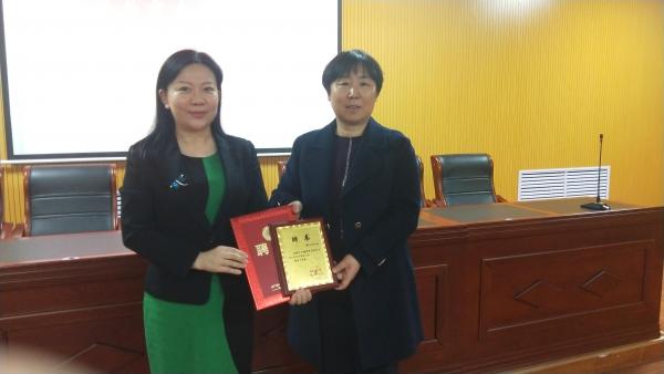 在聘任仪式上,姚丽英代表学校向付丽颁发聘任证书。