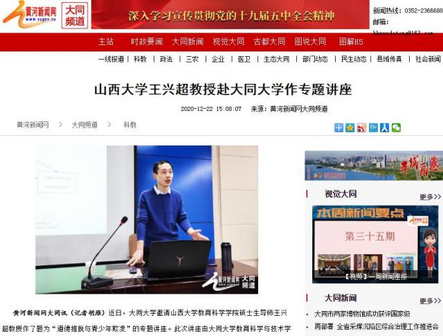 黄河新闻网大同讯(记者胡雁)近日,大同大学邀请山西大学教育科学学院硕士生导师王兴超教授作了题为“道德推脱与青少年欺凌”的专题讲座。此次讲座由大同大学教育科学与技术学院副院长黄淑珍主持,教育科学与技术学院师生聆听了本次讲座。