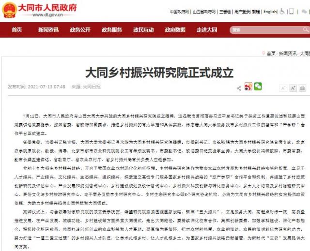 7月12日,大同市人民政府与山西大同大学共建的大同乡村振兴研究院成立揭牌,这是我市贯彻落实习近平总书记关于扶贫工作重要论述和视察山西重要讲话重要指示,按照省委、省政府部署要求,推进乡村振兴的有力举措和具体实践,标志着大同大学服务我市乡村振兴工作的智库和“产学研”合作平台正式建立。