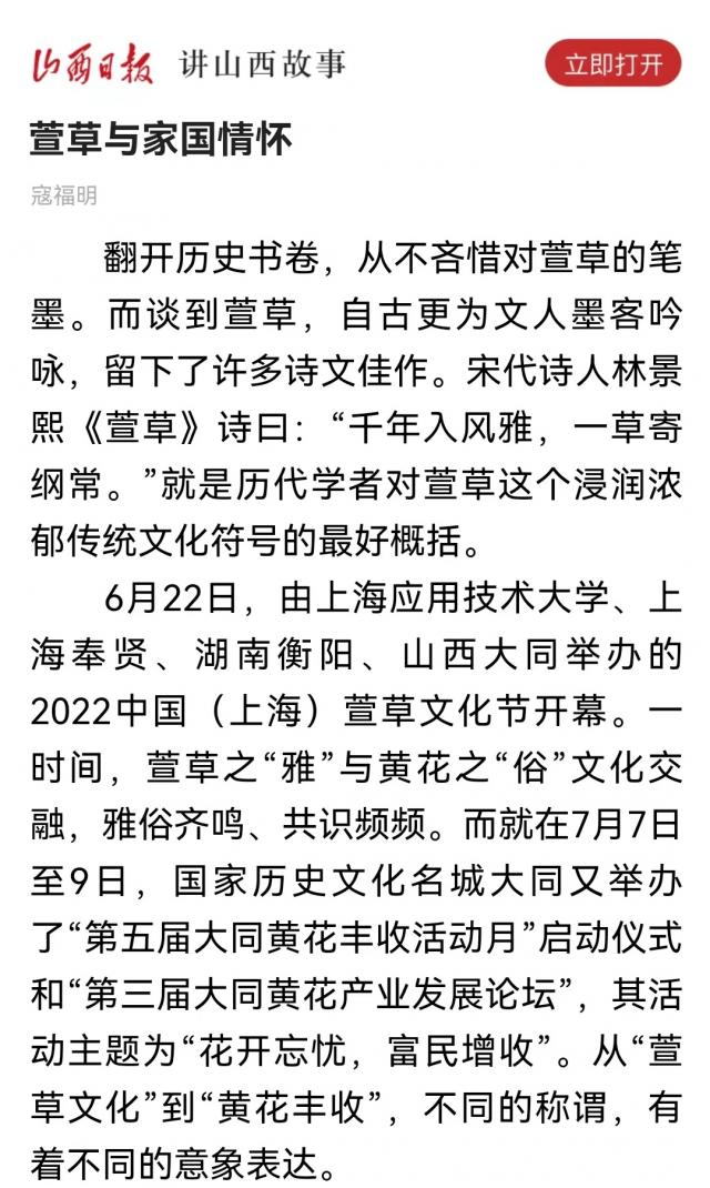 6月22日,由上海应用技术大学、上海奉贤、湖南衡阳、山西大同举办的2022中国(上海)萱草文化节开幕。一时间,萱草之“雅”与黄花之“俗”文化交融,雅俗齐鸣、共识频频。而就在7月7日至9日,国家历史文化名城大同又举办了“第五届大同黄花丰收活动月”启动仪式和“第三届大同黄花产业发展论坛”,其活动主题为“花开忘忧,富民增收”。从“萱草文化”到“黄花丰收”,不同的称谓,有着不同的意象表达。