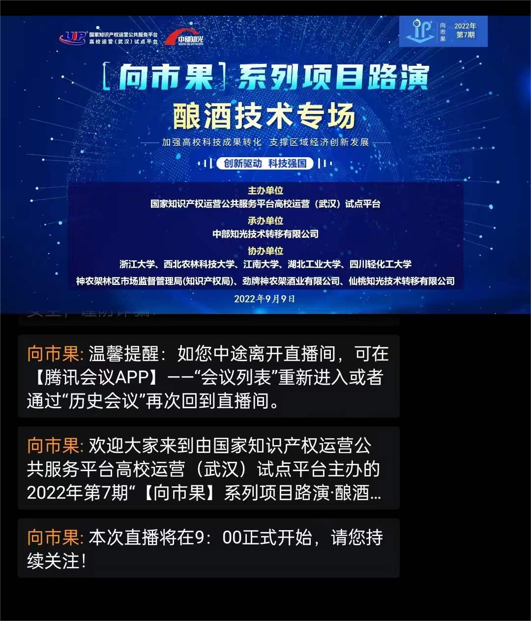 为促进科技成果转化,提升我校服务地方经济建设的能力,9月9日上午,科学技术部组织我校教师通过网络直播的方式收看了【向市果】系列项目路演第7期酿酒技术专场交流会。本次交流会由国家知识产权运营公共服务平台高校运营(武汉)试点平台主办,中部知光技术转移有限公司承办,浙江大学等单位协办。参会对象为酿酒相关产业科技型企业管理人员、研发人员及相关工作人员,高校院所酿酒技术相关科研团队等。我校教师积极参加了本次交流会。