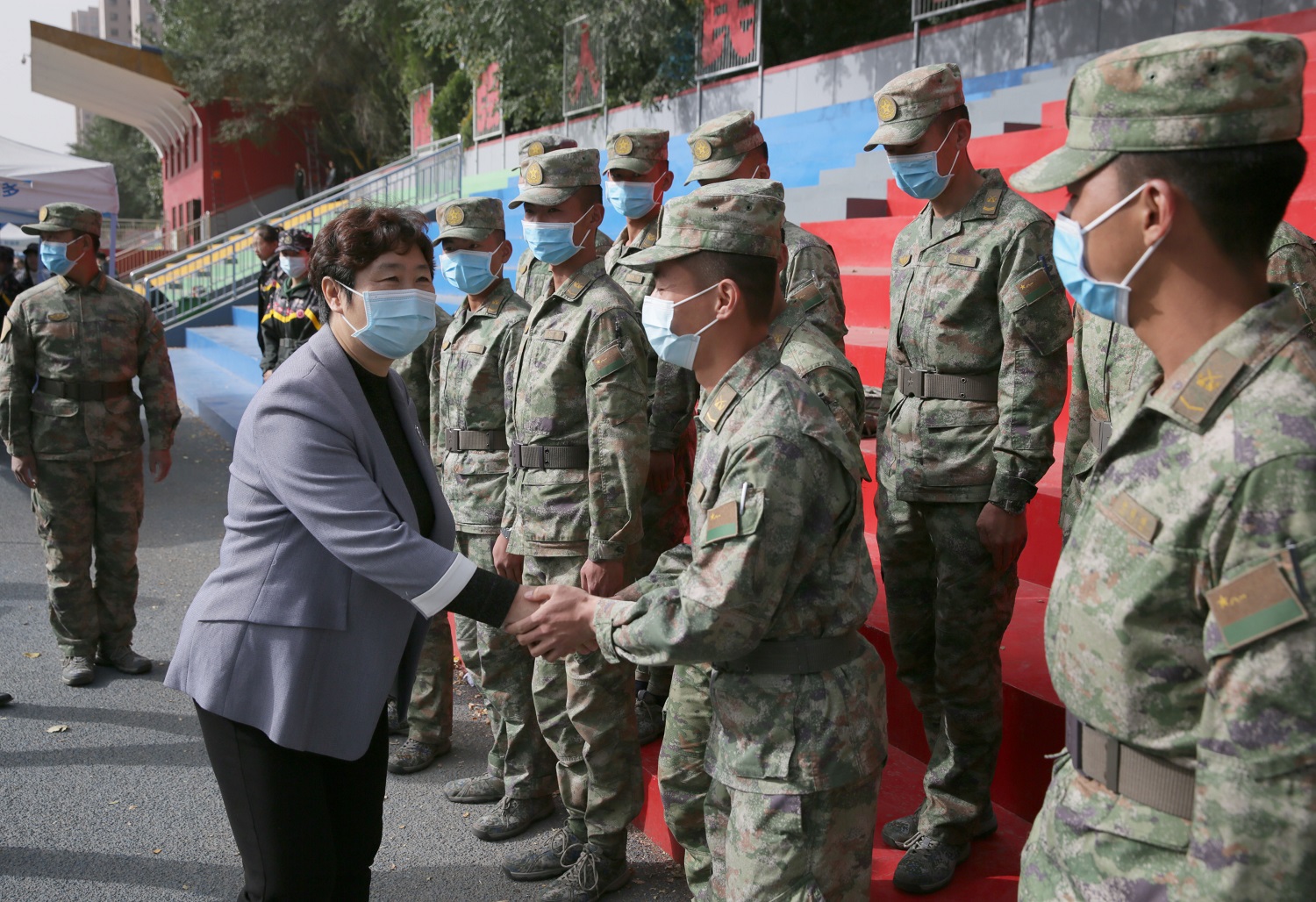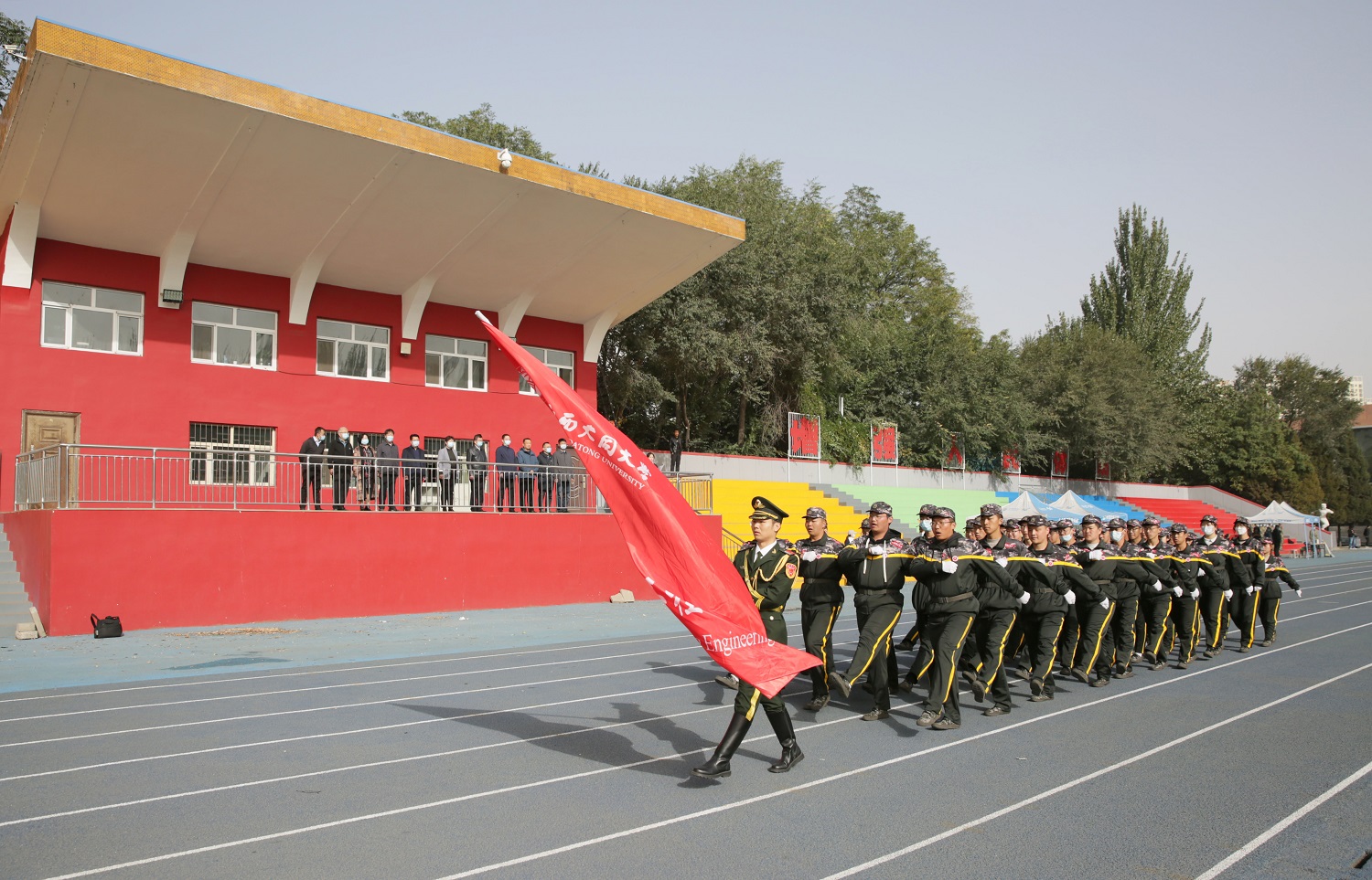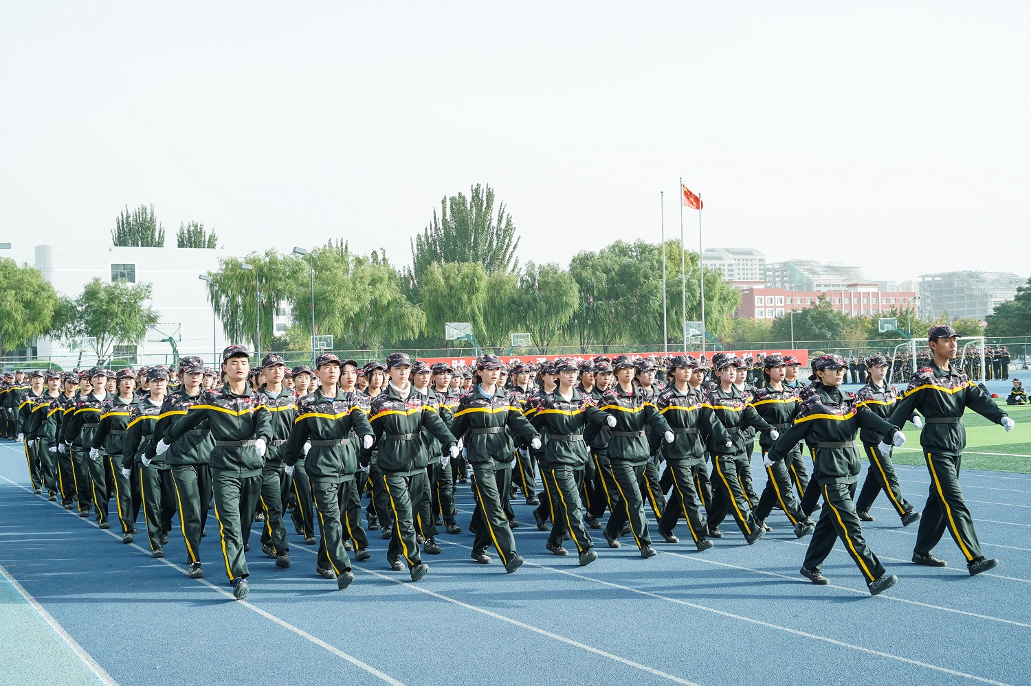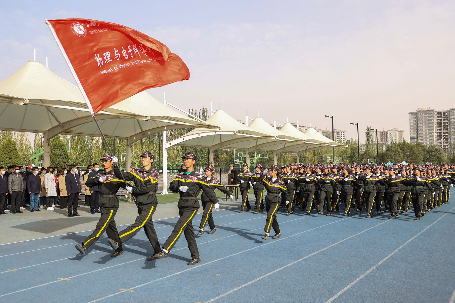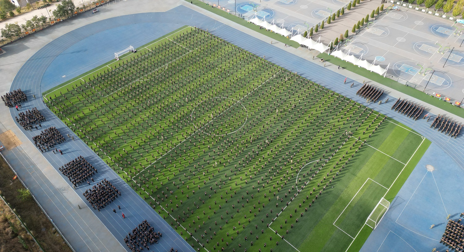 十月的学校,金风送爽,彩旗猎猎,嘹亮的解放军进行曲响彻四方,鲜艳的国旗高高飘扬。经过了意志和纪律的考验,经过了体力和毅力的锤炼,经过了汗水和泪水的洗礼,10月8日上午9时,我校2022级新生军训成果展示活动在御东校区和新平旺校区同时展开。由于受到疫情的影响,上级主管部门明确要求不搞军训汇报表演活动,我校依据上级的指示精神,今年军训活动结束后不举办大型的汇报表演,各营在各自的军训场地展示军训成果,不搞集中展示、不准人员聚集。御东校区在学生训练的南、北校区操场进行展示活动,校党委书记赵水民、党委副书记寇福明在御东校区随机巡视观摩了部分学院的军训成果;新平旺校区在学生训练场地操场举行活动,校党委副书记、校长姚丽英,校党委常委、副校长张旻巡视观摩了新平旺校区的成果展示活动。