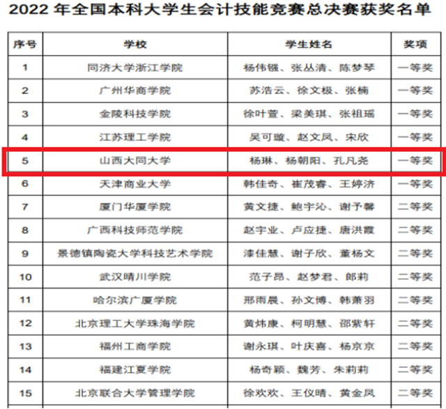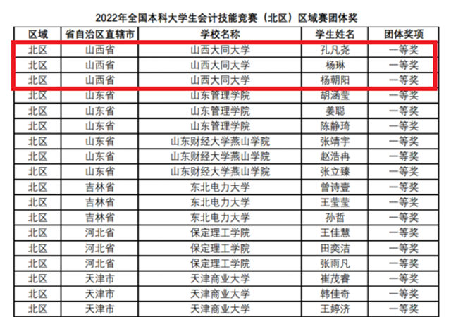 黄河新闻网大同讯(记者吴星)近日,2022年全国本科大学生会计技能竞赛圆满落下帷幕。经过激烈的角逐,大同大学商学院21级会计专升本班孔凡尧、杨琳、杨朝阳在比赛中脱颖而出,取得了全国一等奖的优异成绩。