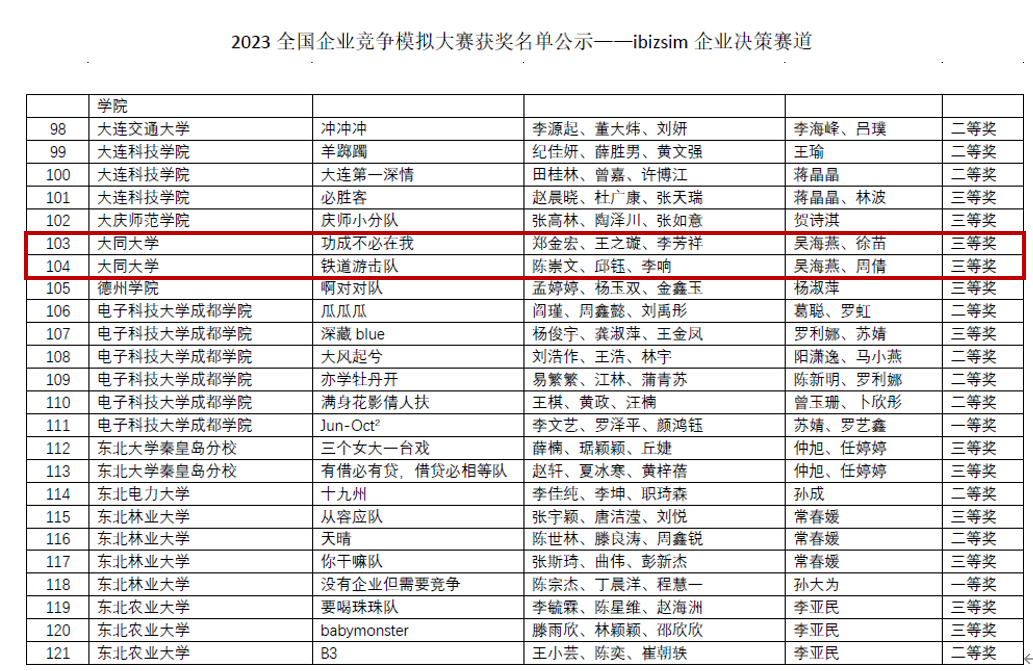 5月20日,由中国管理现代化研究会决策模拟专业委员会主办的第十四届全国企业竞争模拟大赛(本科组)正式落下帷幕,本次大赛分为校内初赛、全国复赛、全国半决赛、全国总决赛四阶段。大赛自3月7日启动以来,有来自全国381所院校共计3356支队伍报名参赛,最终我校商学院由吴海燕、周倩、徐苗老师指导的2020级物流管理二班学生郑金宏、王之璇、李芳祥组成的“功成不必在我队”和2022级物流管理一班学生陈崇文、邱钰、李响组成的“铁道游击队”荣获全国三等奖的佳绩。