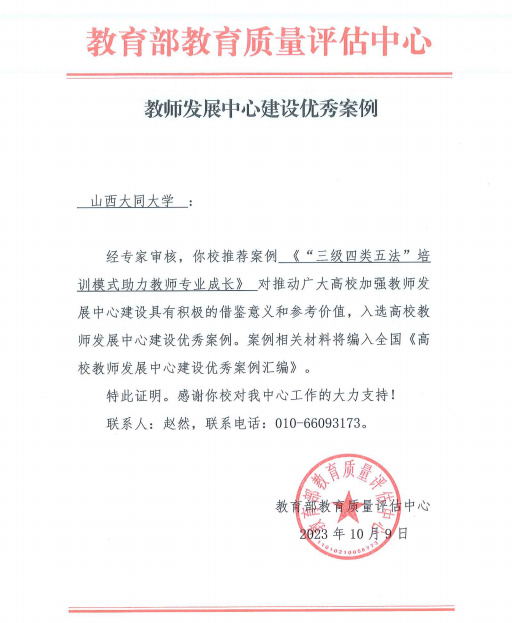 日前,教育部教育质量评估中心公布全国高校教师发展中心建设优秀案例评选结果,经过专家层层审核把关,我校教师发展中心申报的《“三级四类五法”培训模式助力教师专业成长——山西大同大学教师发展工作典型案例》成功获评优秀案例,这是继获得全国高校教师网络培训中心“优秀组织奖”之后,我校教师发展中心获得的又一殊荣。