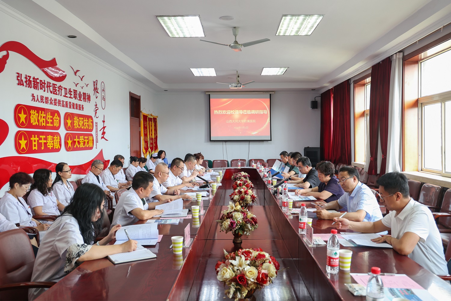 赵水民作总结讲话。他强调,附属医院党委要进一步扛牢主体责任,围绕以高质量党建引领医院高质量发展主题,切实发挥政治功能和组织功能,履行好把方向、管大局、作决策、抓班子、带队伍、保落实的领导职责。就医院下一步工作,赵水民提出要求,一要以班子的精气神带动全院上下担当作为。班子成员要进一步提高站位、提振士气,抓住领导干部这个关键少数,紧扣事业发展中存在的问题,坚定信心、决心、恒心,深入思考、谋划出路、抓好落实。二要以思想大解放谋划医院大发展。要建立健全上下联动机制,充分融入大同市公立医院高质量发展专项行动;要开展同类型院校大调研,借鉴“他山之石”,汲取“发展之道”;要走出去大拜访,以高水平合作推动实现共赢发展;要开展改革大讨论,集思广益、凝聚智慧,形成切实可行的问题解决方案。三要以小切口改革推动医院内涵建设。要立足实际,找准切入点,深化改革,全面推进医院治理体系和治理能力现代化。希望医院班子不断加强自身建设,认真贯彻党委领导下的院长负责制,团结协作、发扬民主,带领医护员工奋力推动医院高质量发展。