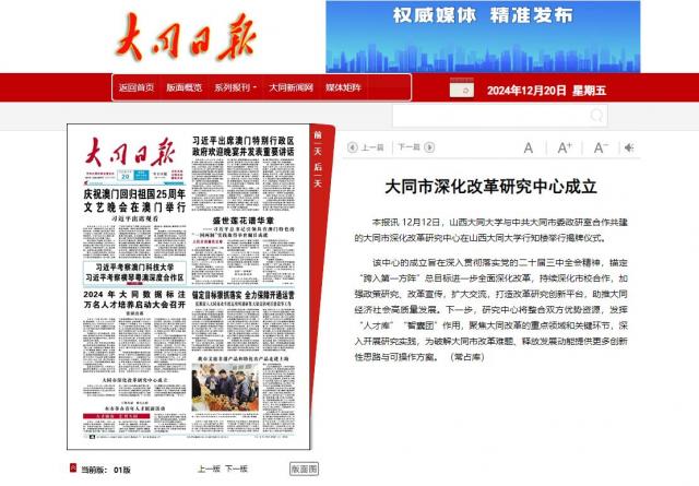 本报讯12月12日,山西大同大学与中共大同市委政研室合作共建的大同市深化改革研究中心在山西大同大学行知楼举行揭牌仪式。