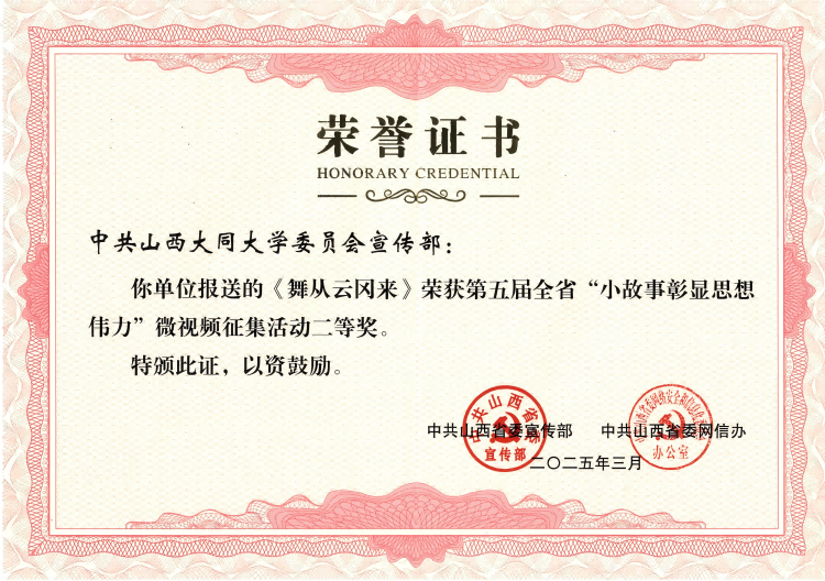 3月17日,第五届全省理论宣讲大赛和“小故事彰显思想伟力”微视频征集活动颁奖仪式在太原举行。由我校党委宣传部统筹策划,并与新闻与传媒学院、音乐学院联合创作的原创作品《舞从云冈来》,从全省数百部作品中脱颖而出,荣获二等奖,并成为全省高校唯一获二等奖作品,代表高校亮相颁奖仪式。