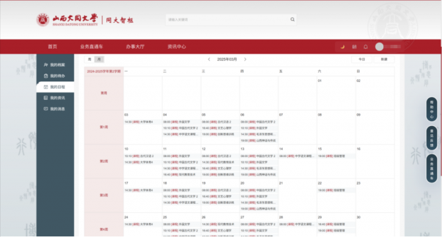 在个人事务管理方面,“同大智枢” 化身为师生的日程中枢与智能管家。师生可在平台上便捷地记录与管理个人日程安排,包括考试时间、会议预约、任务截止日期等。此外,日程还与师生课表联动,当学校课表信息发布,师生的课表信息就能自动同步到日程,方便师生及时获取课程安排,助力师生有条不紊地安排学习、工作与生活,提升时间利用效率与个人事务管理能力。
