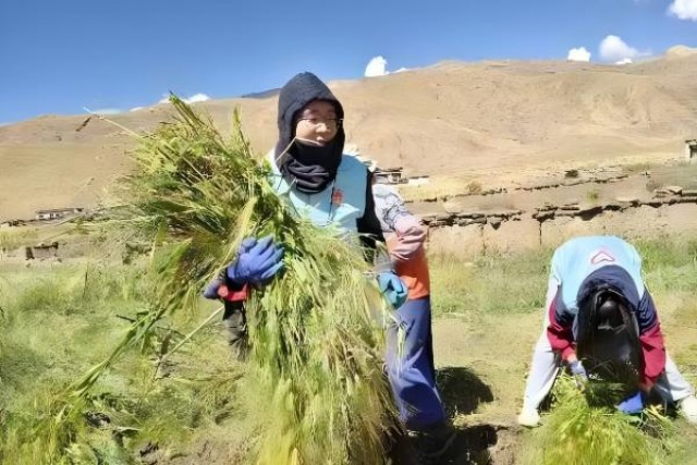 杨晨浩(左一)下乡帮老乡收割青稞