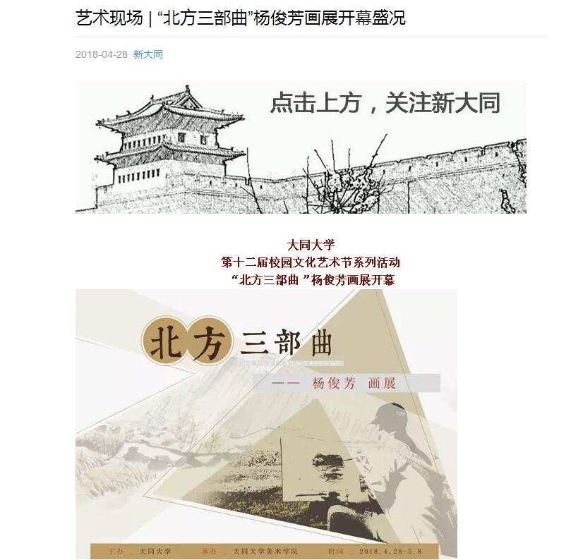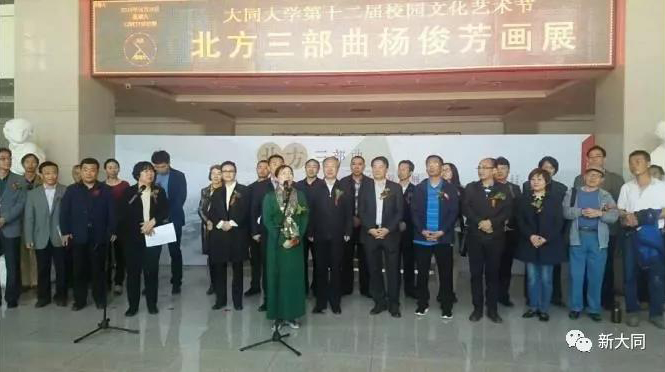 备受文化界关注的“北方三部曲”杨俊芳画展于4月28日开幕。此次画展是大同大学第十二届校园文化艺术节的重要艺术活动,是高校精品艺术与古都文脉联姻,传承历史,直面当下,充满时代大爱的一次艺术展览,也是校园文化“走出去”,把精品节目推向社会,扩大学校社会影响力的文化盛事。