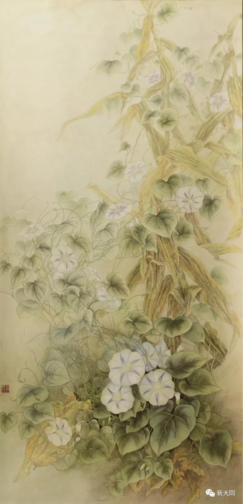 其一,杨俊芳画作中大量表现北方风物和乡间事物,有一些前人所忽略的领域。山野古堡,是北地画家共同的命题,但杨俊芳在此之外,更多地描绘了大地上的作物和微小生命的气息,比如牵牛花、葫芦藤、向日葵、玉米杆、豆荚花、红薯苗、枣树、苹果树乃至野葛草蔓,我手画我心,以熟悉的草木抒怀,堪如画卷上的诗经。